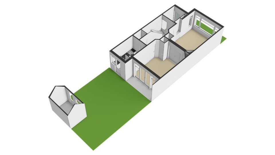 Via de hal komt u uit in de gang. In de gang bevindt zich het toilet en een bergruimte. Vanaf de gang zijn er 2 deuren die toegang geven tot de kamer en suite. De voorkamer kan afgesloten worden van de achterkamer met glas in lood deuren. Tenslotte komt u via de gang uit in de keuken. De achtertuin met schuur is bereikbaar vanaf de achterkamer via openslaande deuren en via de keukendeur. In de tuin is een vrijstaande stenen schuur met een achterom.