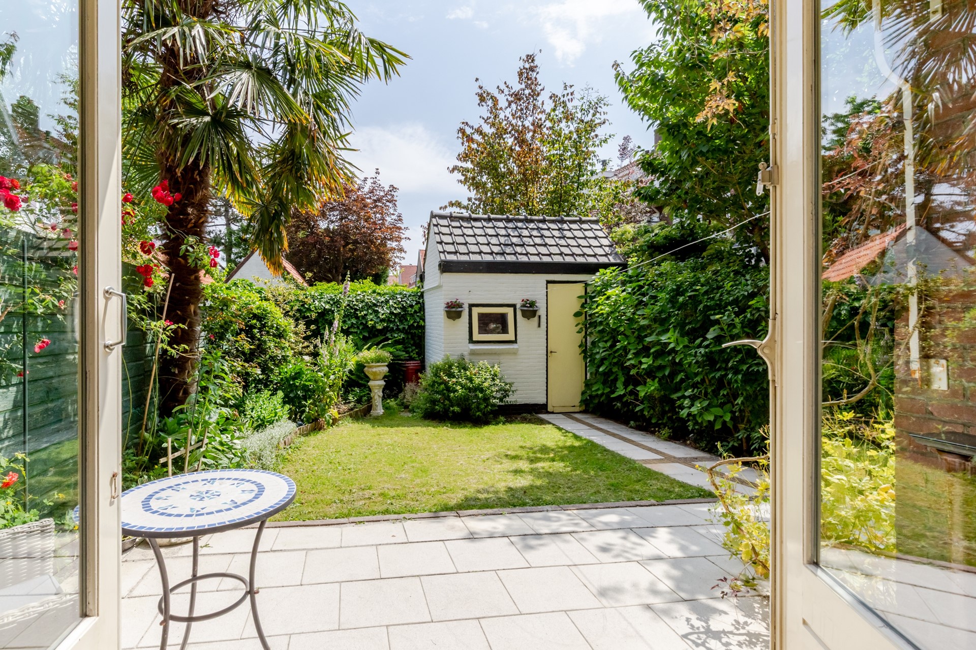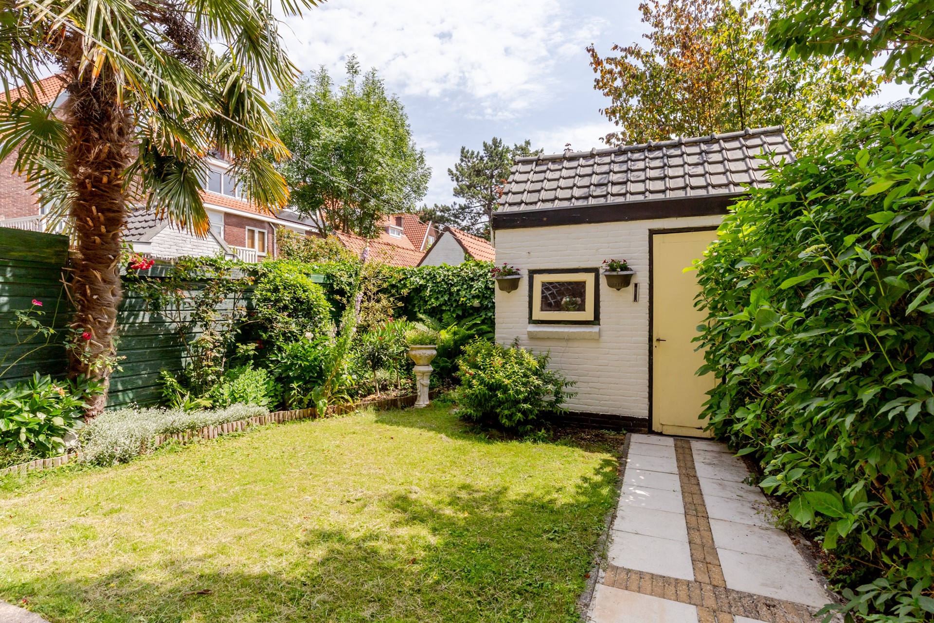 De tuin ziet er verzorgd uit en heeft een vrijstaande stenen schuur met een achterom. Ook is er een kleine voortuin.
