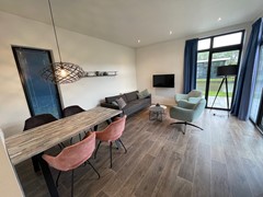 De indeling van de woning is praktisch. De lichte woonkamer met grote ramen en toegang tot het terras grenst aan de luxe en volledig ingerichte keuken, voorzien van (uiteraard) een electrische kookplaat, magnetron/oven, vaatwasser en een koel/vries combi. Er zijn twee slaapkamers met beiden 2 en in totaal 4 slaapplaatsen. De badkamer is voorzien van de douche, het badkamermeubel met spiegel en een toilet.